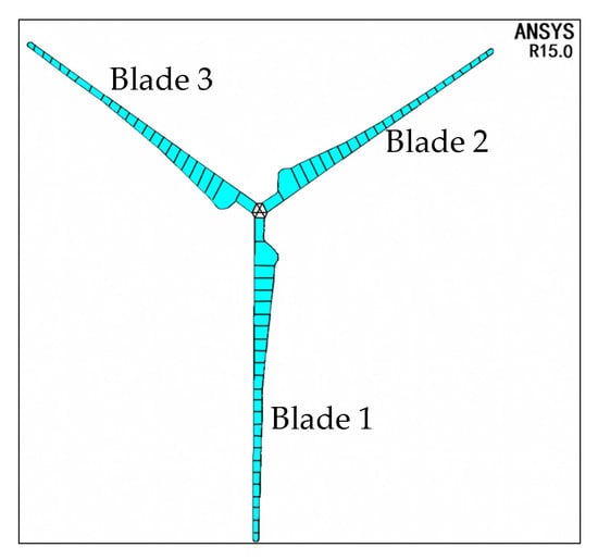 In this paper, the NACA63-415 airfoil is used for blade modeling. The length of each blade model is 49 m, and the material density and elastic modulus are 1950 kg/m3 and 2.8 1010 N/m2, respectively. The shell 181 element was used, and each node has 6 DOF. The corresponding blade model is displayed in Figure 4. The mode analysis was conducted employing ANASYS software (R15.0). It assumes isotropic properties for all materials and the blade structure in a state of elastic deformation throughout the analysis. The model employed in this study is a simplified representation that utilized the same airfoil shapes to establish the modal and does not account for the coupling between different materials.