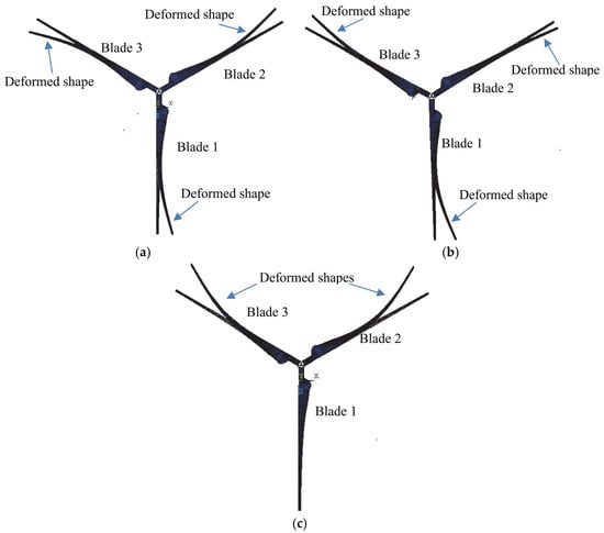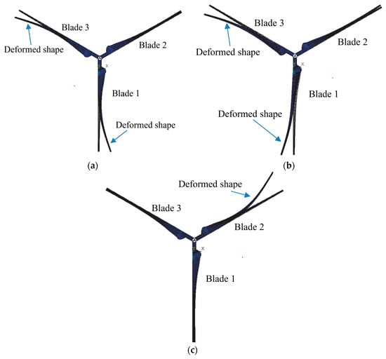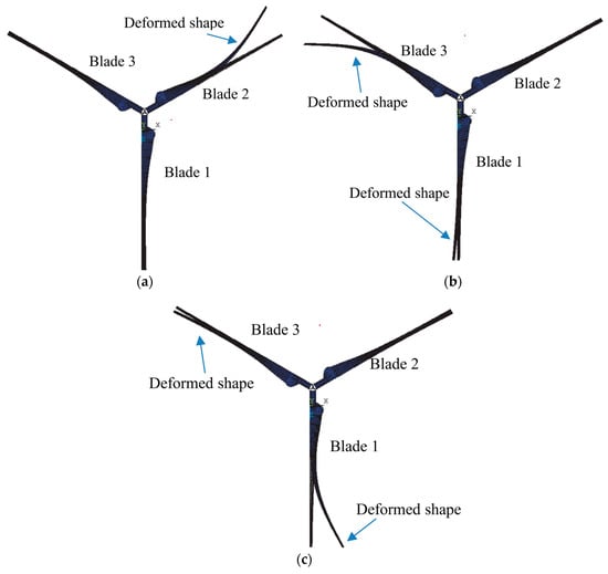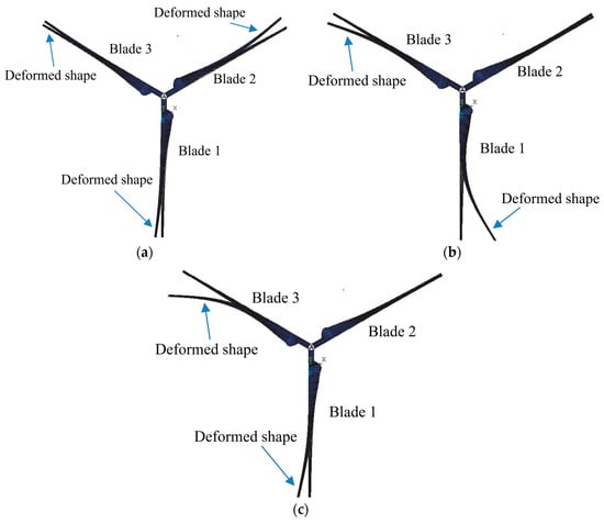 Blade element theory is a common method for designing wind turbine blade profiles and is conducive to improving the conversion rate of wind energy. The central concept of this theory is to decompose a wind turbine blade into tiny segments in the spreading direction. The angle of each blade element is different along the radial direction in one blade. In practice, it is difficult to ensure that the installation angles of the blade elements at the corresponding positions of the three blades are the same; thus, the geometry is simulated by changing the installation angles of the blade elements, and the detuning variance is also set to 0.002. Comparing Figure 5 and Figure 8, it can be seen that after geometric detuning, the displacement of the first-order mode shape mainly occurred on blade 2, with the displacement amplitudes of blades 1 and 3 being quite similar. The modal localization in the structure has already appeared. The displacement of the second-order mode shape is concentrated on blade 1, with smaller displacement amplitudes for blades 2 and 3. The displacement of the third-order mode shape is mainly concentrated on blade 3, with the smallest displacement amplitude on blade 2. This case analysis demonstrates that under geometric detuning, the first three orders of detuned mode shapes all exhibit different degrees of modal localization.