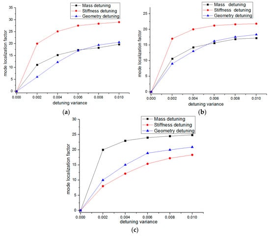 The change curve of the localization factor with detuning degree: (a) the first-order detuning mode shape, (b) the second-order detuning mode shape, (c) the third-order detuning mode shape.