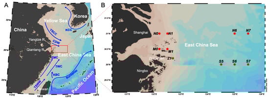 Schematic diagram of the sampling stations. The schematic map of the most influential currents around the eastern ECS areas in summer (Pane (A)). Arrows with solid lines represent the currents that flow in the given direction. Abbreviations for the ocean currents are marked forfor the Yellow Sea Coastal Current (YSCC), Changjiang Diluted Water (CDW), Taiwan Warm Current (TWC), Zhe Min Coastal Current (ZMC), Taiwan Strait Warm Water (TSWW), Kuroshio Branch Current (KBC), and Korea Coastal Current (KCC). The red box is for the sampling area shown in Pane (B).