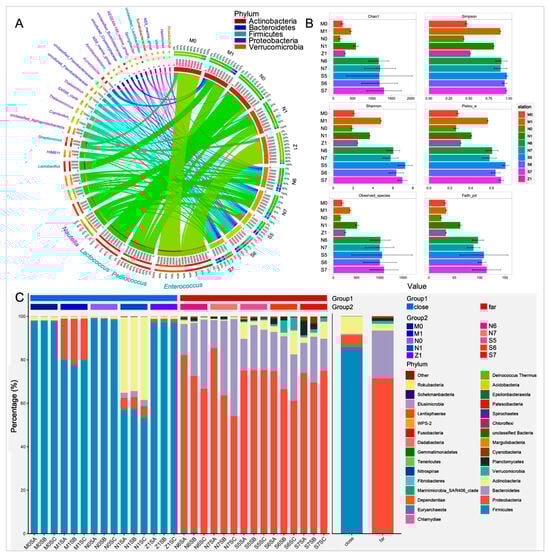 Microbial community structure analysis of the surface bacterioplankton in the investigated stations in the eastern ECS areas. Pane (A): The circos analysis at the genus level. The left half circle displays the most abundant 30 genera, with different colors representing various phylum-level classifications. Within each genus, the lines represent the proportions of samples in different groups. The right half circle displays different sampling stations, and the lines represent the proportions of different genera. Read number in the inner circle represents the bacterial abundance at the genus level; the percentage in the outer circle represents the proportion of the composition in that genus. The areas of each colored ribbon describe the contributions of different genera to different stations. Pane (B): Alpha diversity of each group, with different colors representing different sampling stations. The alpha diversity index for each station was calculated as the average of all samples, with error bars representing the SEM. Pane (C): The stacked bar plots of species at the phylum level were generated for each sample. Group 1 indicates the samples in the nearshore and offshore stations, and Group 2 indicates the different stations.