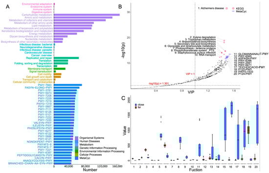 Functional prediction of the bacterioplankton communities in the samples of the nearshore and offshore stations. Pane (A): The results of the KEGG functional prediction and MetaCyc functional prediction. Pane (B): The PLS-DA of the bacterioplankton functions. The red dots represent the obtained top 10 KEGG pathways that show significant differences between the samples of the nearshore and offshore stations, while the blue dots represent the top 10 MetaCyc pathways obtained. The y-axis is for the negative logarithm of significance, with the horizontal dashed line indicating p = 0.05. The x-axis is for the variable importance in the projection (VIP) value to estimate the importance of each variable, with the vertical dashed line indicating a VIP score of 1, which served as a threshold for selecting significant pathways. Pane (C): The t-test analysis for the statistical difference of the predicted biological functions.