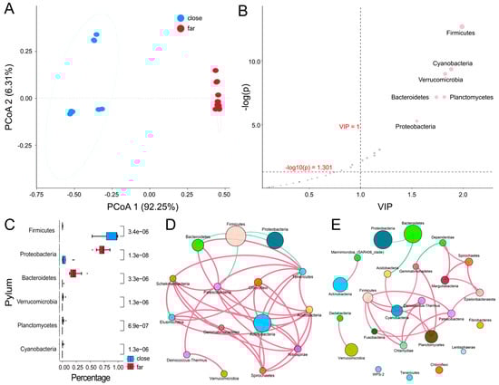 The beta-diversity analysis of the surface bacterioplankton communities between the nearshore and offshore groups. Pane (A): PCoA analysis based on the phylum abundance, where blue solid circles are for the nearshore group and red solid circles are for the offshore group. Pane (B): PLS-DA for the two groups. The red dots are for the species with the most distinct differences between the two groups. The y-axis represents the negative logarithm of significance, with a horizontal dotted line at p = 0.05. The variable importance in the projection (VIP) is represented on the y-axis, with a vertical dotted line at VIP = 1 as the threshold value for the selection. Pane (C): The t-test analysis of different species in the two groups. Pane (D): The co-occurrence network analysis for the nearshore group. Different colors represent various phyla, where the sizes of the nodes are for the relative abundance and the lines are for the correlation, with the red color for the positive and the green for the negative correlation, respectively. Only the correlation relationships with p < 0.05 and |r| > 0.6 are shown. Pane (E): The co-occurrence network analysis of the offshore group.