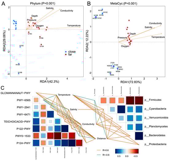 Correlation analysis between the bacterioplankton species, functions, and environmental factors. Redundancy analysis (RDA) showing the relationship between the physicochemical parameters and bacterial abundance at the phylum level (Pane (A)), and the bacterial MetaCyc metabolic pathways (Pane (B)). Pane (C): Mantel correlation analysis between the environmental factors with taxa classification at the phylum level and the predicted bacterial function. The colors of the lines are for the correlations, with orange for a positive and green for a negative correlation, respectively. Only the correlation relationships with p < 0.01 are shown.