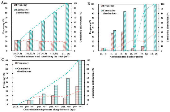 Frequency and cumulative distributions of the central maximum wind speed along the track (A), the annual landfall number (B), and the central minimum pressure along the track (C) in the Northwest Pacific (broken lines represent GSTCH data; bar charts represent TCBT data).