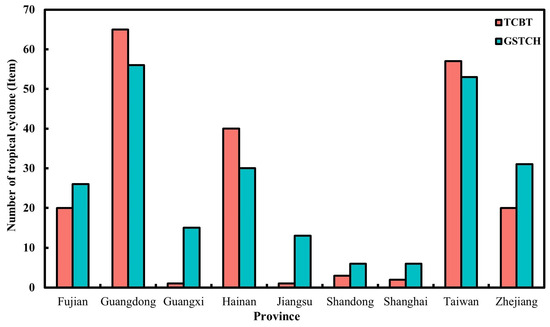 Figure 4 shows the number of TCs in the TCBT and GSTCH datasets that made landfall in each province. The study period of the TCBT and GSTCH datasets is 32 years, with the former ranging from 1990 to 2021 and the latter being the ensemble average of 10 different sets of 32 year periods which are selected at random from the GSTCH dataset.