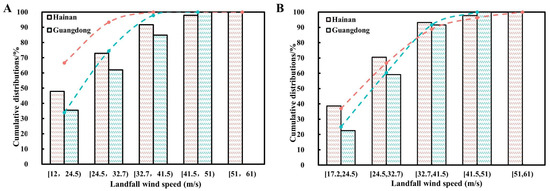 Cumulative distributions of the landfall wind speeds considering (A) and ignoring (B) tropical depressions in Guangdong and Hainan provinces (broken lines represent GSTCH data; bar charts represent TCBT data).
