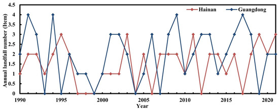 Annual landfall number of TCs in Guangdong and Hainan provinces during 1990–2021.