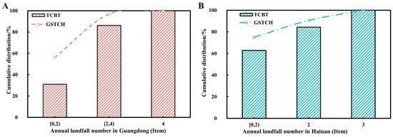 Cumulative distributions of the annual landfall number of TCs in Guangdong (A) and Hainan (B) provinces.