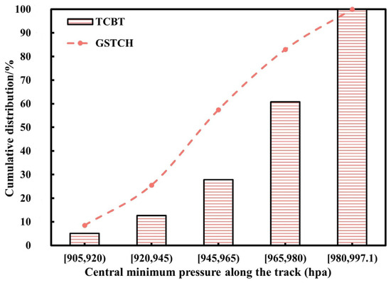 As shown in Figure 10, during June–October, the mean differences in the central minimum pressure along the track of TCs that made landfall in Guangdong province are very small and within the range of standard deviation of each other. The GSTCH dataset overestimates the mean central minimum pressure along the track in September, and the standard deviation of the central minimum pressure along the track in the GSTCH dataset does not pass the F-test at the 95% confidence level (Table 6). The cumulative distributions of the central minimum pressure along the track of TCs that made landfall in Guangdong province in September in the GSTCH and TCBT datasets are shown in Figure 11.