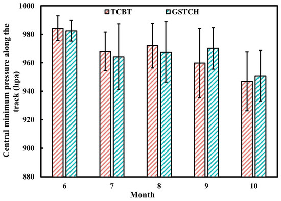 Guangdong is the province with the most frequent occurrence of TCs making landfall along the coast of China, and the landfall period is concentrated mainly between June and October. Differences in sea level pressure and sea surface temperature at different times affect the magnitude of the central minimum pressure along the track, and the central minimum pressure along the track in the GSTCH dataset considers environmental conditions (i.e., monthly mean sea level pressure and monthly mean sea surface temperature) [2]. Therefore, this study verifies the degree of consistency between the central minimum pressure along the track of TCs that made landfall in Guangdong province during June–October in the GSTCH and TCBT datasets.