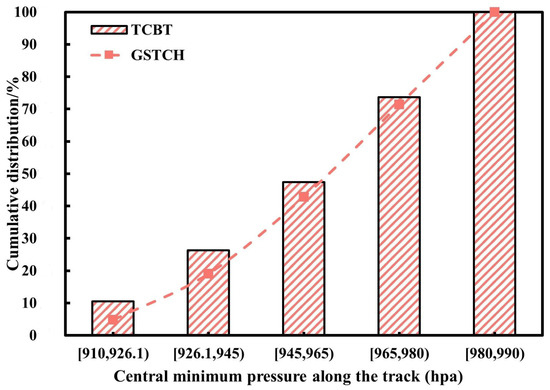 Cumulative distributions of central minimum pressure along the track of TCs in Guangdong province.