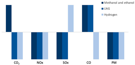 The main objective of using alternative fuels on board ships is to reduce emissions generated by maritime transport, which may differ depending on the type of fuel used. Figure 1 shows the effect of alternative fuels on engine emissions with respect to fossil fuels. As it can be seen, methanol and ethanol decrease the emission of nitrogen oxides (NOX), sulfur oxides (SOX), and minor particles (PM), while increasing the emission of carbon dioxide and monoxide (CO2 and CO). LNG reduces CO2, NOX, SOX, and PM emissions, although it increases CO emissions. Hydrogen has the lowest carbon footprint possible of all alternative fuels (Table 1).