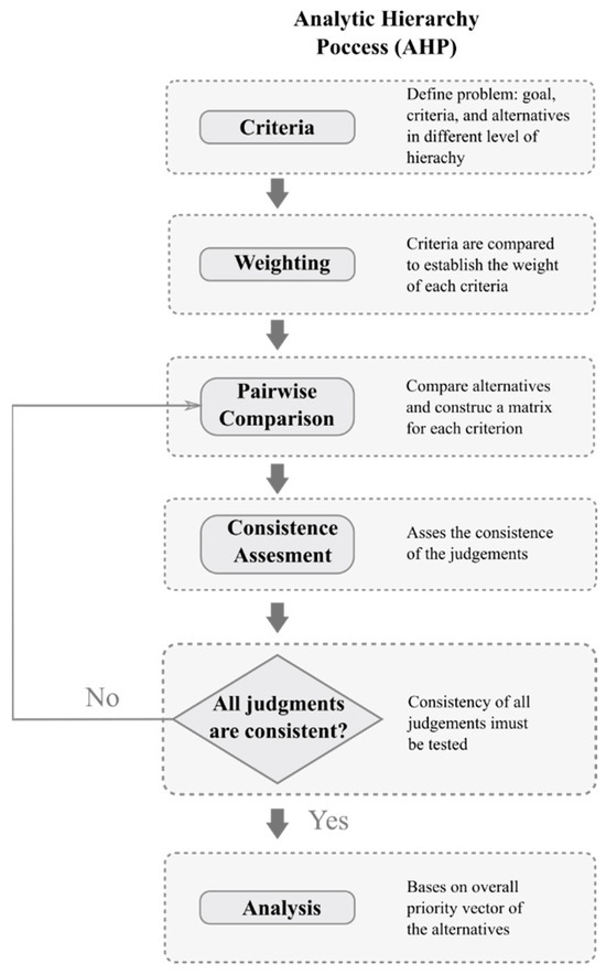 Multi-criteria decision-making methods (MCDM) consist of a multi-step process with the aim of structuring and formalizing a decision to solve a problem. These methods analyze a series of criteria (cost, efficiency, environment, etc.) that are relevant for the problem and determine the best alternative according to the selected criteria. Many MCDMs have been developed and applied in different fields [25]. The most commonly used are Analytic Hierarchy Process (AHP), Technique for Order of Preference by Similarity to Ideal Solution (TOPSIS), Preference Ranking Organization Method for Enrichment Evaluation (PROMETHEE), and Complex Proportional Assessment (COPRAS), with the AHP being the most popular [26]. Each multi-criteria decision-making method presents advantages and disadvantages that must be considered.