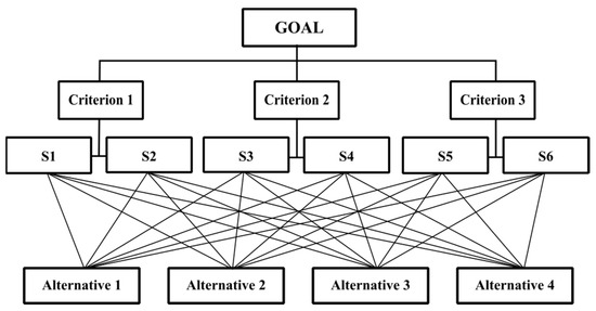 Firstly, a hierarchical framework is created in which the objective to be achieved is placed at the top, followed by the main criteria necessary to reach the goal, the sub-criteria at the intermediate levels, and the alternatives at the lowest levels (Figure 3). In addition, it allows possible contradictions between them to be handled to reach a more objective and clear decision.
