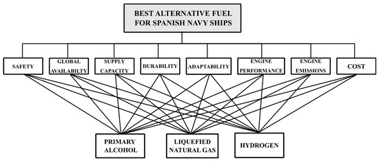 AHP is suitable for qualitative analysis and allows for the evaluation of alternatives against alternatives. TOPSIS can be used in qualitative or quantitative analysis and evaluates the distance of alternatives with respect to an ideal point. PROMETHEE makes qualitative or quantitative analyses using specific software. COPRAS is only suitable for quantitative analyses, and the alternatives have to be sorted in descending order [25]. The aim of this research is to select the best alternative fuel for Spanish Navy ships. AHP was considered the most suitable for this research for being a qualitative analysis that compares among different alternative fuels, but taking into account that it depends heavily on the accuracy and consistency of pairwise comparisons, which can be subjective as well as influenced by individual biases.