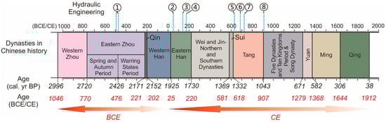 Timeline of dynasties in Chinese history. The Yue State was one of the Warring States during the late period of Eastern Zhou and the Wuyue State belongs to the period of the Five Dynasties and Ten Kingdoms. Also indicated are the major hydraulic engineering events (①–⑧) that took place on the coast of Hangzhou Bay recorded in historical documents: ① The hydraulic engineering of Yue State (493–473 BCE); ② The seawall of Eastern Han (50 CE); ③ Jianhu Lake (140 CE); ④ Great Xixian Levee and South Lake (173 CE); ⑤ Yanguan Seawall (630 CE); ⑥ Shanyin Seawall (686 CE); ⑦ Kuaiji Seawall (722 CE); ⑧ Wuyue Seawall (910 CE).