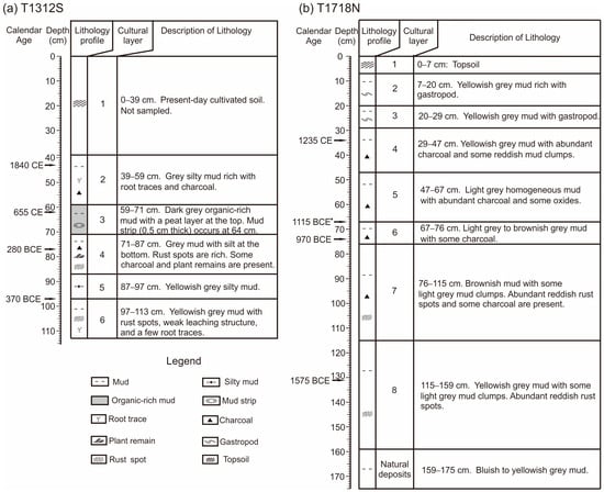 Profile T1718N was divided into nine layers from bottom upward according to the lithology (Figure 3b). Layer 9 (175–159 cm) was composed of bluish mud changing upward to yellowish grey mud. Layer 8 (159–115 cm) was composed of yellowish grey mud with a small number of light grey mud clumps, had a large number of reddish rust spots, and was speculated to be the deposits of Shang Dynasty. The charcoal at 131 cm yielded an age of 1575 BCE, consistent with the archaeological judgement. Layer 7 (115–76 cm) was composed of brownish mud with a small number of light grey mud clumps. A large number of reddish rust spots and some charcoal were also found. This layer was suggested to have been formed during the late period of the Shang dynasty. Layer 6 (76–67 cm) was composed of light grey to brownish mud with a small amount of charcoal. The dating result of charcoal at 74 cm was 970 BCE; and the dating result of charcoal at 67 cm was 1115 BCE, being overestimated according to the archaeological judgement. Layer 5 (67–47 cm) was composed of light grey homogeneous mud with a lot of charcoal and a few brownish rust spots. Layer 4 (47–29 cm) was composed of yellowish grey mud with a large amount of charcoal and occasional brick-red clasts. The charcoal at 34 cm was dated to 1235 CE. Layer 3 (29–20 cm) was composed of yellowish grey mud with a few gastropod shells. Layer 2 (20–7 cm) was composed of yellowish grey mud with more gastropod shells. Layer 1 (7–0 cm) was topsoil. After excluding the overestimated age at 67 cm, the other three ages were used in the Clam program to calculate the age–depth model (Figure 4b) [53].