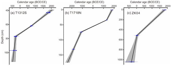Age-depth model calculated using Clam [53]: (a) Profile T1312S; (b) Profile T1718N; (c) Core ZK04.