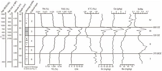 During stage II (layer 5–4; 370 BCE to 120 CE), TN, TC, TOC, and C/N all increased markedly at the bottom, then remained stable, and subsequently increased again towards the top, with ranges of 0.06–0.49%, 0.30–6.28%, 0.22–6.04%, and 3.90–12.28. δ13C values (−26.96 to −23.71‰) decreased from the bottom to the top. The contents of Sr, Ca, and Ba remained low, and Ba decreased slightly in the middle. The mean values were 9.09 mg/kg, 1.64 g/kg, and 21.35 mg/kg, respectively. The Sr/Ba ratio was opposite to that of elemental Ba, higher in the middle and lower parts and decreasing upward.