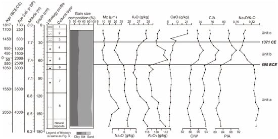 The vertical variation in the content of each element and chemical weathering index was obvious in profile T1718N (Figure 6). According to their variations, three units were divided from the bottom up: unit a (layer 9–6; before 695 BCE)—Na2O, K2O, and Al2O3 contents were higher in the lower part and decreased obviously in the upper part, with variations ranging within 5.85–7.52 g/kg, 25.83–29.17 g/kg, and 120.13–141.26 g/kg, respectively. CaO varies insignificantly. CIA, CIW, and PIA were all low, and Na2O/K2O was the highest in the whole profile. Unit b (layer 5–4; 695 BCE to 1371 CE), the content of Na2O (mean value 4.16 g/kg) decreased remarkably, the content of Al2O3 (mean value 138.65 g/kg) increased obviously, and the content of K2O (mean value 26.67 g/kg) and CaO (mean value 8.19 g/kg) increased slightly. CIW, CIA, and PIA remarkably increased as the highest in the whole profile, ranging within 90.15–92.45, 75.46–77.74, and 87.99–90.69, respectively, and Na2O/K2O decreased obviously, ranging from 0.20 to 0.27. Those together indicate enhanced chemical weathering. Unit c (layer 3–1; after 1371 CE), the mean value of Na2O increased slightly to 4.58 g/kg, the mean value of K2O increased to 28.43 g/kg, and the mean value of Al2O3 (mean value 131.37 g/kg) decreased obviously. The CaO was lower in the lower part of the unit and increased dramatically in the upper part of the unit, which was consistent with the fact that more gastropod shells were seen in the upper part, indicating the contribution from the carbonate phase. CIA, CIW, and PIA all declined, with mean values of 74.09, 89.71, and 86.96, respectively, and Na2O/K2O rose slightly to 0.24.