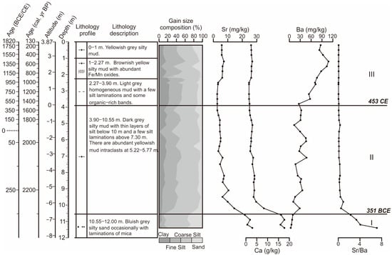 Three sections (I–III) were recognized according to the vertical variation in the alkaline earth metals: from 12 to 10.55 m (section I, about 5900 BCE), Sr and Ca contents were at a high level, with mean values of 24.35 mg/kg and 16.86 g/kg, respectively, and Ba content (6.67 mg/kg) was very low. The Sr/Ba ratio was high, with a mean value of 4.20. At 10.55–3.90 m (section II, 351 BCE to 453 CE), the contents of Sr and Ca and Sr/Ba ratio decreased remarkably with mean values of 6.13 mg/kg, 3.27 g/kg, and 0.26, respectively, and Ba showed an increasing trend from the bottom upward but fluctuated markedly. Above 3.90 m (section III, after 453 CE), the contents of Sr and Ca and Sr/Ba ratio maintained low values, and Ba increased obviously to an average of 76.40 mg/kg.