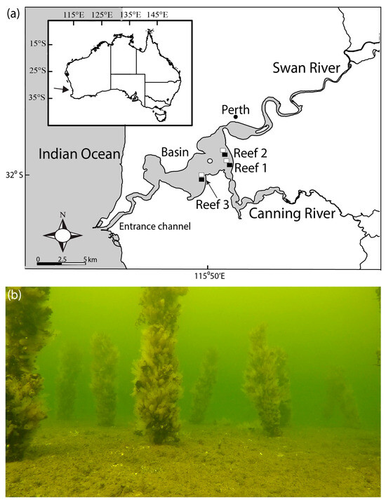 The Swan-Canning Estuary (32.0° S and 115.9° E) in south-western Australia is ~50 km long, has a surface area of ~55 km2, and remains permanently open to the Indian Ocean (Figure 1) [20]. Although most of the estuary is shallow (<2 m in depth), it reaches a maximum depth of ~20 m in the entrance channel, and up to ~17 m in the main basin. The composition of the sediment differs markedly between the shallow marginal shoals (<2 m deep) and the deeper waters (>2 m deep). Nearshore substrates contain a greater proportion of medium-grain-size sand than the offshore sediments, which comprise higher percentages of particulate organic matter and finer inorganic particles (i.e., silt and fine sand) [39].