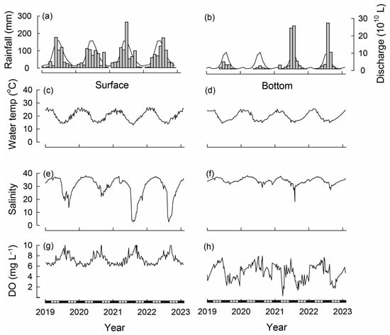 Long-term average (line) and total monthly (bars) (a) rainfall (recorded at Perth Airport) [30] and (b) freshwater discharge into the Swan River (recorded at Walyunga) between 2019 and 2023 [41]. Weekly surface (0.5 m depth) and bottom (6.0 m depth) values for (c,d) water temperatures (e,f) salinities and (g,h) dissolved oxygen (DO) concentrations in the Swan-Canning Estuary basin (recorded at Heathcote) [41]. Black and white bars on x-axis refer to seasons.