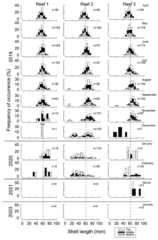Monthly shell length–frequency histograms (%) of 5 mm-length classes of translocated Mytilus galloprovincialis (and recruits) attached to the bottom, middle and top sections of wooden stakes used to create three bouchot-style reefs in the Swan-Canning Estuary. n = number of mussels sampled from three stakes from each reef in each month. Dashed vertical lines show shell length of 60 mm for reference.
