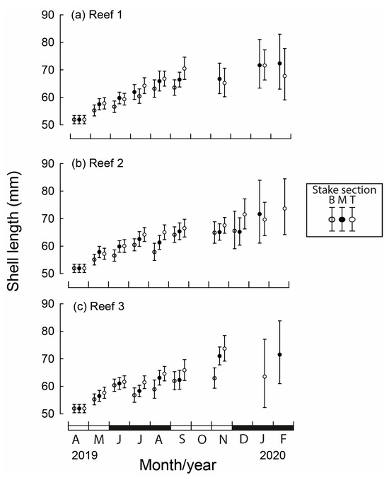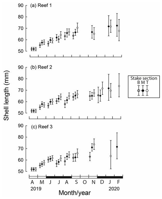 Between May 2019 and February 2020, the mean lengths of M. galloprovincialis differed significantly between months, reef site and stake section (all p < 0.001) and significant interactions existed among the three factors (p = 0.038). The mean length at seeding in April was 51.9 mm (Figure 4). At the beginning of spring (September), the mean lengths attained ranged from 57.3 mm at Reef 1 to 67.5 mm at Reef 3. The mean length in each month was typically the lowest for the bottom section of the stake and greatest for the top section. For example, in September, the mean shell length at Reef 1 was 7.0 mm less on the bottom than the top stake section (Figure 4a).