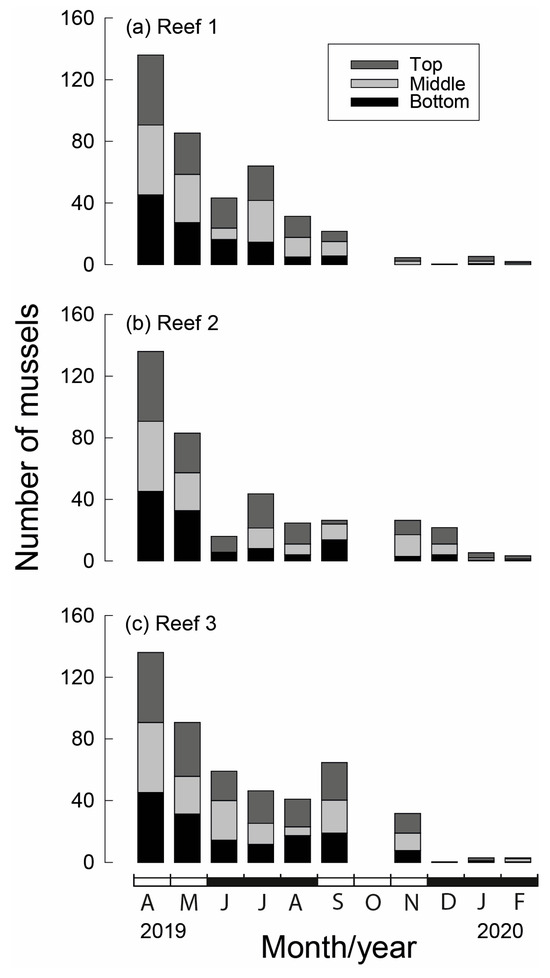 Of the original 136 M. galloprovincialis seeded on each stake at the commencement of the study (April 2019), on average, between 83 and 91 survived for one month, representing a decline in numbers of 33–39% (Figure 6). While between May and September numbers declined by a further 68 to 75% at Reef 1 and Reef 2, numbers at Reef 3 declined by only 29%. By November, the average number of individuals per stake had declined to five at Reef 1, 26 at Reef 2 and 32 at Reef 3. High mortality continued at Reef 3 in the ensuing month, leaving <3 mussels per stake for the remainder of the study, which was similar to the number of mussels alive on each stake at Reefs 1 and 2. The overall numbers (May to February) were greatest at Reef 3 (1101 ind.) and least at Reef 1 (915 ind.), while Reef 2 contained 1007 individuals and the total numbers of individuals throughout the study were the greatest on stake top sections (1074 ind.) and lowest on bottom sections (904 ind.), while the middle section of the stake yielded 1045 individuals (Figure 6).