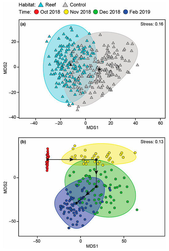 No significant differences were detected between the number of species or total MaxN among Habitat, Time or their interaction before deployment of the reefs (Table A2; Figure A1a–d). Faunal composition was shown not to differ significantly with Habitat, either as a main effect or in the Time × Habitat interaction term, although a difference over time was detected (Table A2). Pairwise PERMANOVA showed this was due to the fauna in October 2018 being distinct from those in all other time periods as well as that in November 2018 being different from February 2019. This is illustrated on the mMDS plots, where the 95% region estimates overlap substantially for Habitat; the points for October 2018 are predominantly discrete from other months, but February 2019 overlays December 2019 and the latter time with that of November 2018 (Figure 7). Temporal changes were driven by the fish community in October 2018 being depauperate and heavily dominated by Favonigobius punctatus and O. rueppellii, with other species such as the southern eagle ray Myliobatis tenuicaudatus recorded in all other months and P. armatus in November 2018, Helotes octolineatus in December 2018 and Atherinidae spp. and Sillago burrus in February 2019 (Figure A2).