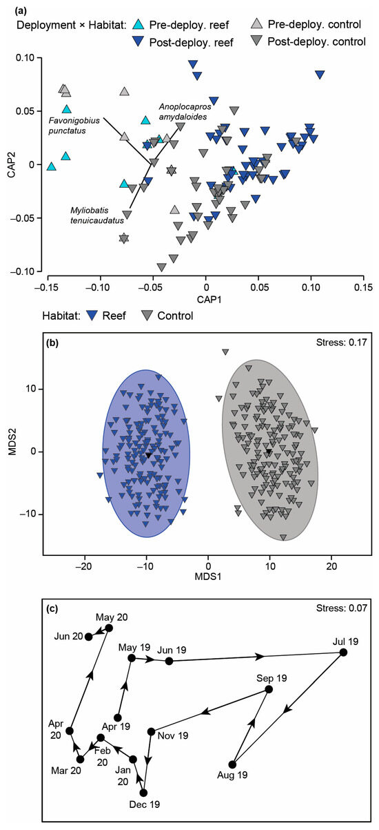 (a) Canonical analysis of principal coordinate plot illustrating differences in the fish composition on the bouchot-style reefs and control sites before and after reef deployment. (b) Two-dimensional mMDS ordination plot constructed from bootstrap averages for Habitat, calculated from a Bray–Curtis resemblance matrix of the MaxN of each fish species in each replicate sample collected after the bouchot-style reefs were deployed in the Swan-Canning Estuary. Group averages (larger symbols) and approximate 95% region estimates fitted to the bootstrap averages are provided. (c) Centroid nMDS ordination plot derived from a distance among centroid matrix of the MaxN of each fish species for each sampling occasion (reefs and control combined). Arrows denote direction of cycling.
