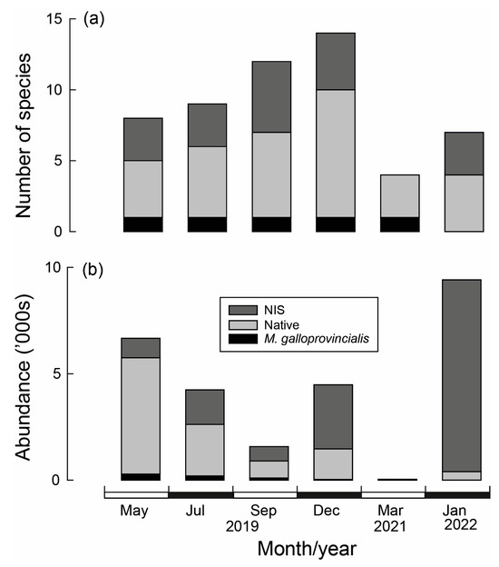 (a) Number of NIS (non-indigenous species), native species and Mytilus galloprovincialis and (b) their abundance collected from wooden stakes used to create bouchot-style reefs in the Swan-Canning Estuary over time.