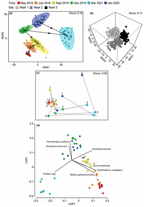 mMDS ordination plot constructed from bootstrap averages for (a) Time and (b) Site, calculated from a Bray–Curtis resemblance matrix of the MaxN of each invertebrate species in each replicate sample collected after the bouchot-style reefs were deployed in the Swan-Canning Estuary. Group averages (larger symbols) and approximate 95% region estimates fitted to the bootstrap averages are provided. (c) Centroid nMDS ordination plot derived from a distance among centroid matrix of the abundance of each invertebrate species for each sampling occasion. Arrows denote direction of cycling. (d) Canonical analysis of principal coordinates plot illustrating differences in the invertebrate composition on the bouchot-style reefs over time.