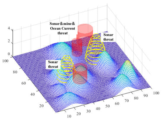 where is the threat coefficient, rim is the linear distance from the i-th track point to the threat source m, RTm is the threat radius of the threat source, and represents the cost from the i-th track point of the j-th AUV to the threat source m. The schematic diagram of each threat is shown in Figure 1.