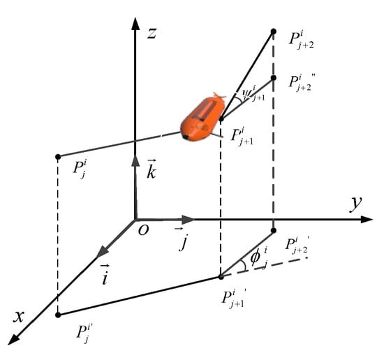 Path smoothness is a necessary condition for generating feasible paths and is calculated by calculating turning and climbing rates. As shown in Figure 2, the turning angle is the angle between two consecutive path segments. and are the projection of the horizontal plane 0xy, set as the unit vector in the z-axis direction, then the calculation equation of the projection vector is:
