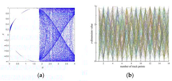 Infinite folding chaotic mapping. (a) Bifurcation diagram. (b) Infinitely folded chaotic map change curve.