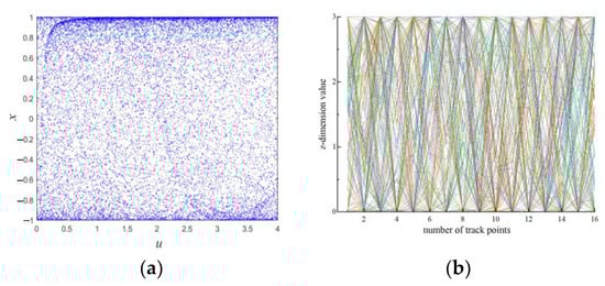 In SI, a set of solutions needs to be maintained, and heuristic rules are used to continuously evaluate and search for the optimal solution. The initial population plays a crucial role in the evolutionary process, influencing the starting point for the SI algorithm to search for the global optimal solution and directly affecting the convergence rate of the population as well as the accuracy of the final solution. MRFO’s initial population is randomly generated, which may result in insufficient population diversity and have a significant impact on iterations. Using chaotic mapping [18] for initialization can have a positive effect on the quality of the initial population. In this paper, we employ an infinite folding chaotic mapping to enhance the quality of the initial population. Its bifurcation diagram is shown in Figure 4a, and the variation curve of the z-coordinate applied to multi-AUV path planning is illustrated in Figure 4b. The update equation for this mapping is as follows: