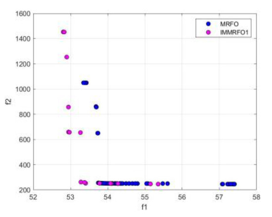 As shown in Figure 5, the chaotic sequence generated by the new chaos map is evenly distributed at its mean value of 0.5. Experimental verification of the improved initialization algorithm was carried out, and the MRFO algorithm of the population was initialized with the new chaotic mapping and compared with the original MRFO. A comparative experiment was conducted on the ZDT1 test function between the MRFO algorithm (referred to as IMMRFO1) and the original multi-objective MRFO algorithm using a new chaotic mapping to initialize the population. The results are shown in Figure 6. Among them, f1 is the objective function 1 of the ZDT1 test function, and f2 is the objective function 2 of the ZDT1 test function. The results were shown in Figure 4. It can be seen from the figure that the improved algorithm effectively reduces the cost of initializing the population.