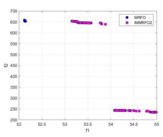 It can be seen from Equation (34) that the designed tumbling coefficient ρ changes continuously with the change of fitness in the iteration process. Adding ρ to manta rays’ tumbling foraging, as shown in Equation (35), ρ is constantly changing, so the tumbling range of manta rays is expanded; that is, the random search range of the population is increased. Comparative experiments were conducted on the ZDT1 test function between the MRFO algorithm (referred to as IMMRFO2) using the adaptive collaborative rolling strategy and the original multi-objective MRFO algorithm. The results are shown in Figure 7. It can be seen from the figure that, compared with MRFO, the new algorithm can jump out of the local optimal better.