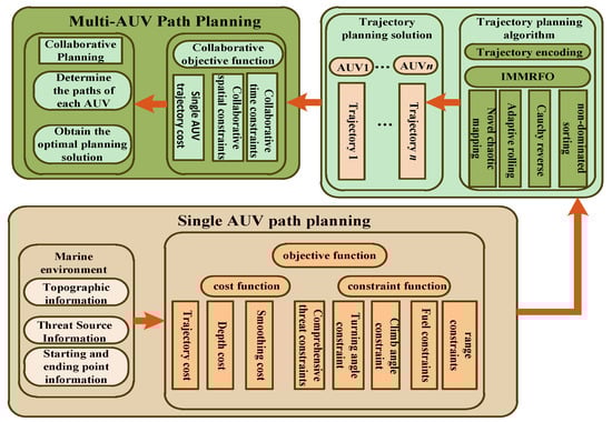 Underwater navigation is an important part of ocean exploration and environmental inspection. Autonomous underwater vehicles (AUVs) play a vital role in these activities. AUVs have been widely used in a variety of underwater tasks, including salvage operations, seabed image sensing, underwater pipeline maintenance, and environmental monitoring [1]. Efficient navigation refers to the complex task of multi-AUV path planning within a continuous underwater space. Existing navigation methods can be broadly classified into two main categories: terrain-based navigation and grid-based navigation. Among the commonly used algorithms, there are two main categories: traditional optimization algorithms, including methods such as the artificial potential field method [2], A* algorithm [3], D* algorithm [4], and intelligent optimization algorithms, including the particle swarm algorithm [5], ant colony algorithm [6], grey wolf optimizer (GWO) [7], etc. Such algorithms enable an AUV to intelligently adapt to and navigate through the underwater environment.
