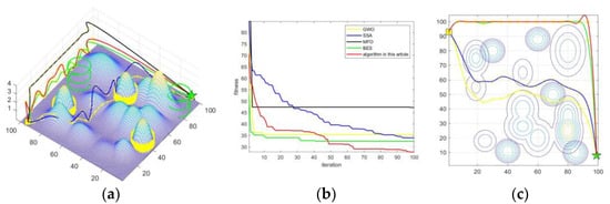 In Figure 11, according to the trajectory cost function (Equation (23)), it is evident that during the AUV’s path planning, it needs to simultaneously avoid terrain variations and threat sources such as underwater mines and ocean currents. The final path depends on the trajectory’s cost function and the optimization algorithm’s ability to find the best solution. If the optimization algorithm has weak search capabilities, the path points may become trapped in local optima, leading the AUV into threat zones or causing collisions with obstacles. From Figure 11a, it can be observed that the path planned by the GWO algorithm collides with underwater mountains. The path generated by the MFO algorithm initially avoids the mountains, but it fails to find a better path during iterations and maintains a high depth throughout the entire trajectory, indicating the insufficient optimization capabilities of the MFO algorithm. In contrast, the path generated by the algorithm proposed in this paper effectively avoids threat areas such as underwater sonars and mines while also navigating around underwater mountains and other obstacles. This is mainly because the optimization capabilities of the algorithm proposed in this paper are stronger. Compared with the other four algorithms, the path planned by the algorithm in this paper is the most optimal. From Table 2, it can be seen that the MFO algorithm has the longest average distance and highest cost, while the algorithm proposed in this paper has the shortest average distance and lowest cost. Relative to the other four optimization algorithms, the algorithm proposed in this paper reduces the average distance by 38.51–216.95 km, decreases the turning and pitch angle cost by 20–160, reduces the optimal cost loss by 4.36–49.97, and improves the success rate of optimization by 1.1–2.25 times. Furthermore, from Figure 11a,b, it can be observed that the SSA and BES algorithms converge too quickly and are prone to getting stuck in local optima. In contrast, the algorithm proposed in this paper can effectively escape local optima and has stronger optimization capabilities. This is because the algorithm in this paper utilizes a Cauchy reverse learning strategy, which provides strong optimization capabilities for individual trajectory points when facing complex terrain. This allows the algorithm to rapidly avoid threats and find the optimal path before encountering threat sources or collisions.