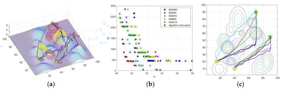 Figure 12a displays the spatial distribution of the shortest-range optimal paths for the two AUVs. Blue represents the path planned by MOGWO, pink represents the path planned by MOSSA, cyan represents the path planned by MOMFO, yellow represents the path planned by MOBES, green represents the path planned by NSGA-III, and red represents the optimal path planned by the algorithm presented in this paper. From Table 3, it can be observed that the algorithm proposed in this paper exhibits superiority in terms of average path length, average threat cost, shortest path length, and minimum threat cost. Compared with other algorithms, the proposed algorithm achieves the shortest path length and the lowest threat cost. Other algorithms show varying degrees of performance across different metrics. For instance, MOSSA, MOMFO, and MOBES have higher threat costs, while MOGWO has slightly longer average path lengths. The paths planned by MOBES cross threat sources multiple times, resulting in higher average and minimum threat costs. Meanwhile, as shown in Figure 12a, it can be seen that the flight paths of AUV1 and AUV2 planned by the algorithm in this paper do not intersect or overlap, indicating that the algorithm achieves spatial collaboration between the UAVs when optimizing the collaborative path planning problem of AUVs. In addition, from the distribution of the optimal Pareto solution set of each algorithm in Figure 10b, it can be found that the optimization effect of the proposed algorithm achieves shorter submerged paths and lower threat costs.