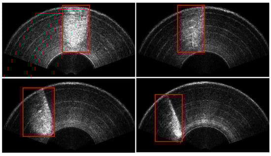 In AUV autonomous obstacle avoidance experiments, we use advanced sonar sensors to capture and analyze images of underwater environments to verify the autonomous obstacle avoidance performance of the proposed IMMRFO algorithm in actual underwater navigation tasks. These sonar images display the underwater scene in front of the AUV for the AUV to take obstacle avoidance measures [26]. The key two-dimensional forward-looking sonar images in the experiment are shown in Figure 13. The red rectangle represents an obstacle.