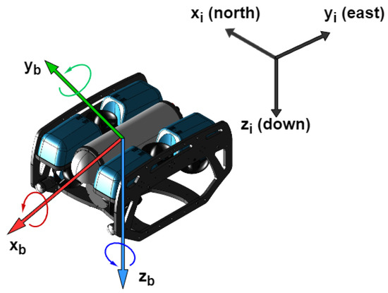 The UUV’s motion states are described using two reference frames: the body-fixed reference frame (BRF) and the inertial reference frame (IRF). The BRF is fixed to the vehicle, with the center of gravity serving as the origin, and the body axes aligned with the principal axes of inertia. The longitudinal axis, denoted as the , extends from aft to fore. The transversal axis, referred to as the , extends from port to starboard. Per the right-hand rule, the axis is perpendicular to both the and axes. The UUV’s motion is characterized as the motion of the BRF relative to the IRF. The IRF is employed to track the vehicle’s trajectory and define the control objectives. In this work, the IRF is aligned with the north-east-down (NED) coordinate system. This choice is motivated by the prevalence of expressing position vectors in NED coordinates within various navigation applications and simulation environments. The axes in IRF are denoted as , , and , as shown in Figure 1.
