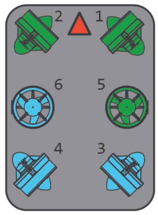 where t is the thrust produced by all propellers, and the layout of six propellers is shown in Figure 2. The blue propellers rotate clockwise, the green propellers rotate counterclockwise, and the red arrow indicates the positive surge direction.