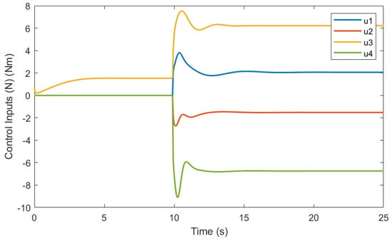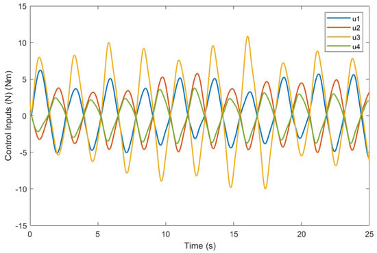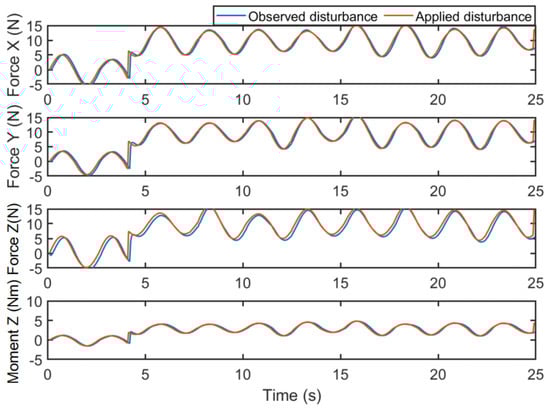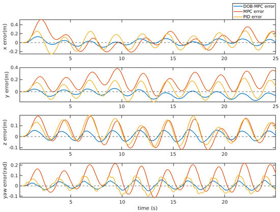 To assess the performance of trajectory tracking, two kinds of movement scenarios are employed. Firstly, a circular path with a radius of 2 m is employed. The UUV’s yaw angle is defined to be relative to the surge direction. To assess the system’s robustness, a 10 N force is applied in the , , and directions, along with a 5 Nm torque around the axis. Figure 16 illustrates the comparison between the estimated disturbances and the generated disturbances. As the disturbance term incorporates unmodeled components from the dynamic model, the disparity between the estimated and generated disturbances can be attributed to the nonlinear damping force experienced by the UUV during circular trajectory movement. The tracking error of PID, MPC, and the proposed DOBMPC is shown in Figure 17, demonstrating a significant reduction in tracking error with the proposed DOBMPC. Additionally, Figure 18 and Figure 19 provide a visual representation of the trajectory tracking results. The corresponding control inputs of the proposed DOBMPC are illustrated in Figure 20.