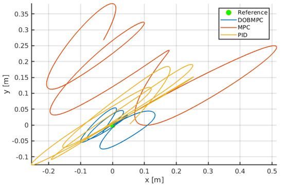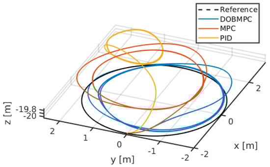 Three-dimensional circular trajectory tracking results of the proposed DOBMPC, baseline MPC, and PID controllers.