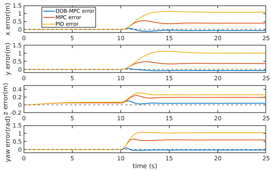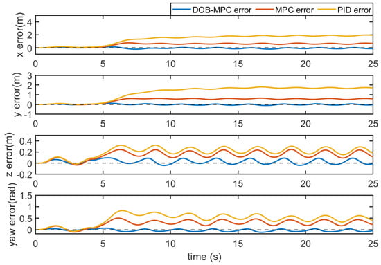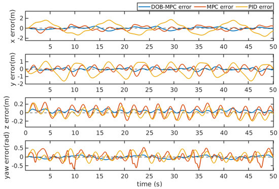 Tracking errors of the proposed DOBMPC, baseline MPC, and PID controllers under superposition of periodic wave and constant current effect.